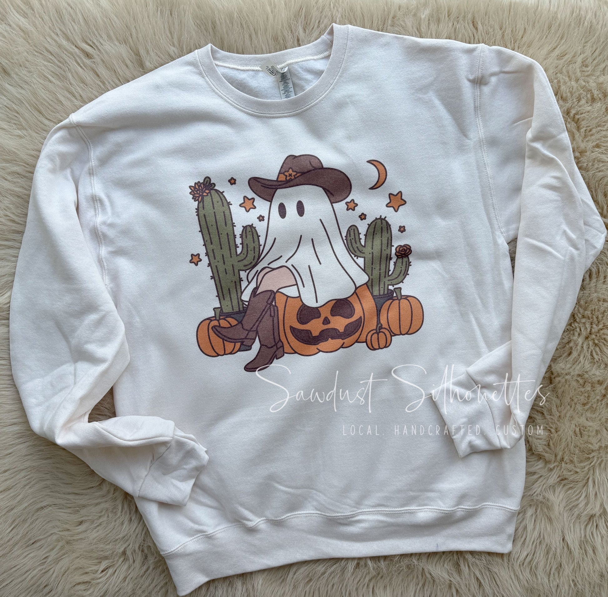 Yee-haw! Don't be scared, embrace the spooky season with our Cowgirl Ghost Tee or Sweatshirt. This cute and playful design is perfect for Halloween and will surely make you stand out. Available in both tee and sweatshirt, stay cozy and stylish all season!