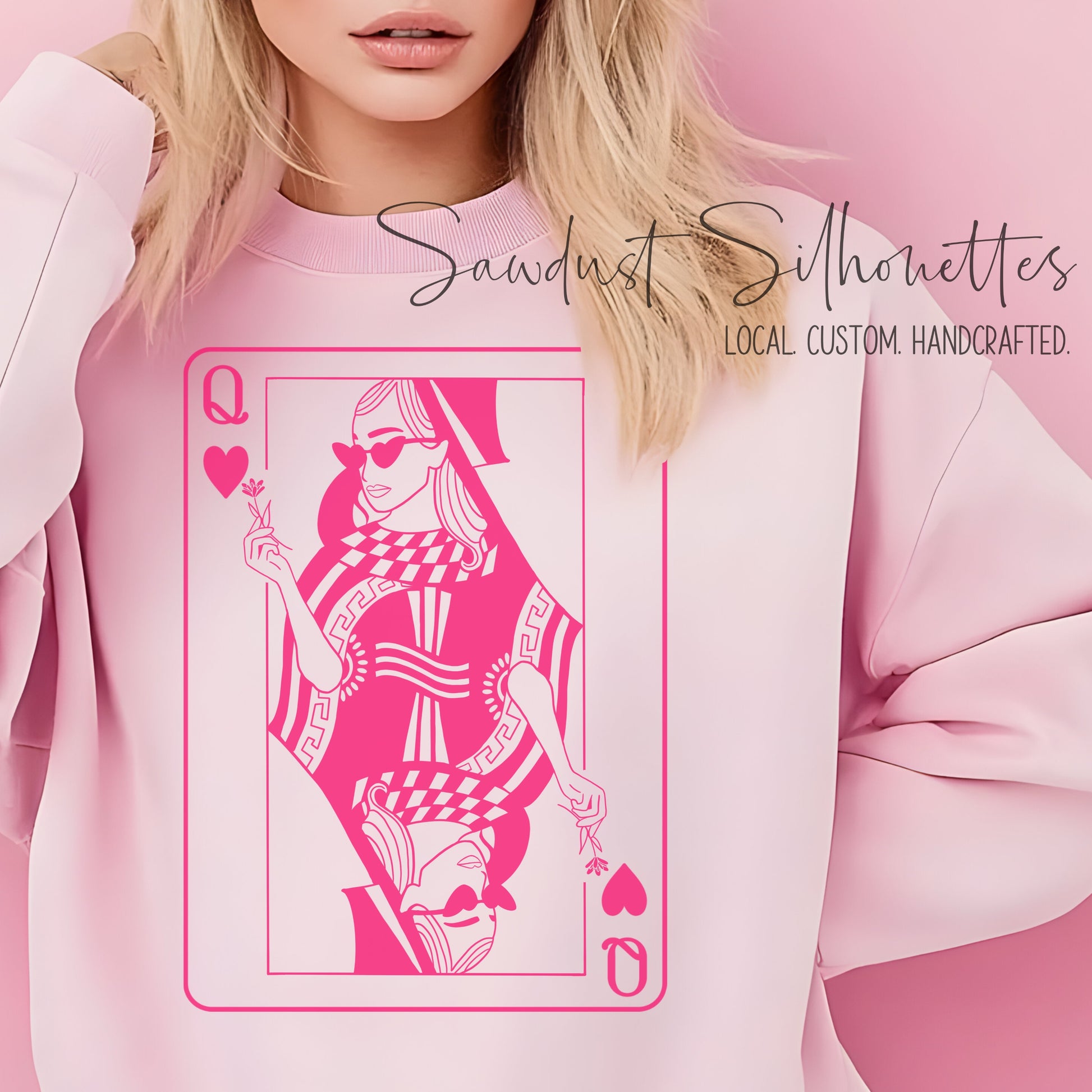 Make a bold statement with our Queen of Your Heart sweatshirt! This stylish pink sweatshirt showcases a modern twist on the classic playing card, featuring a chic Queen of Hearts design. This cozy, custom-made piece is both eye-catching and comfortable. Locally crafted with love, it’s the perfect addition to your casual wardrobe or a unique gift for the queen in your life!